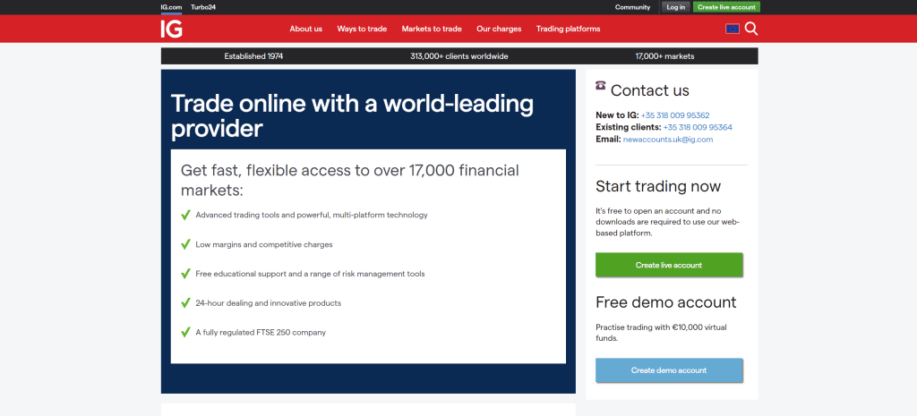 IG is a highly trusted broker that deals with the brokerage of CFDs on forex, shares, commodities, indices, options and more. IG offers a wide range of trading platforms. These include the MetaTrader 4, the IG online trading site platform, ProRealTime, L2 dealer, and a wide range of user-friendly trading apps for Android and iOS. Additionally, IG offers its clients a demo account to familiarize them with the trading environment and its services.