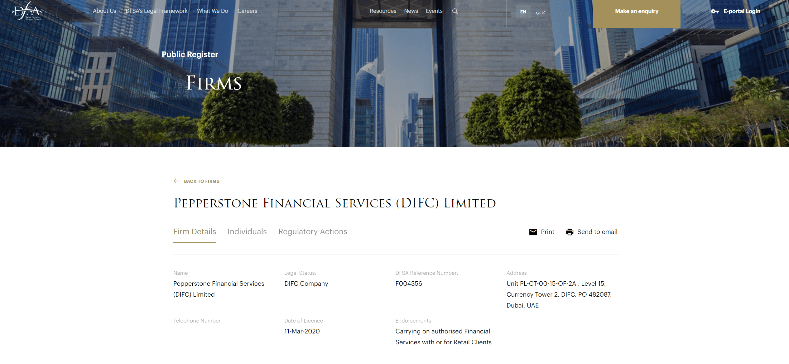The DFSA is an independent regulator that oversees financial services in the Dubai International Financial Centre (DIFC). Forex brokers operating within the DIFC jurisdiction must obtain a license from the DFSA. The regulator assures traders within the jurisdiction of a high level of regulatory scrutiny and compliance.