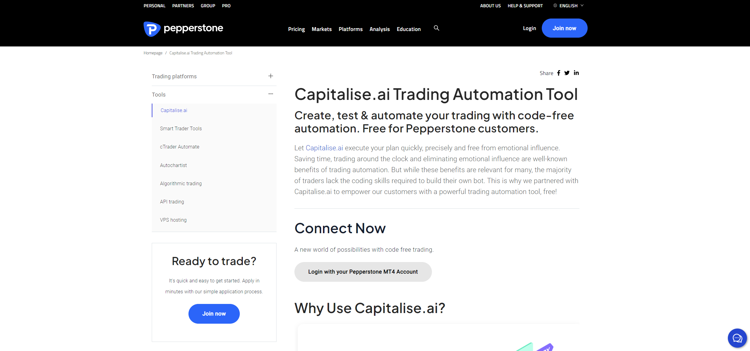 Pepperstone is a reputable forex and CFDs broker with a partnership with Capitalise.ai. Clients of this broker can use this tool to automate and test their trading strategies. The added advantage of using Capitalise.ai is that anyone can code their trading strategies using plain language. This means that traders do not need to have a technical background to utilise this tool.