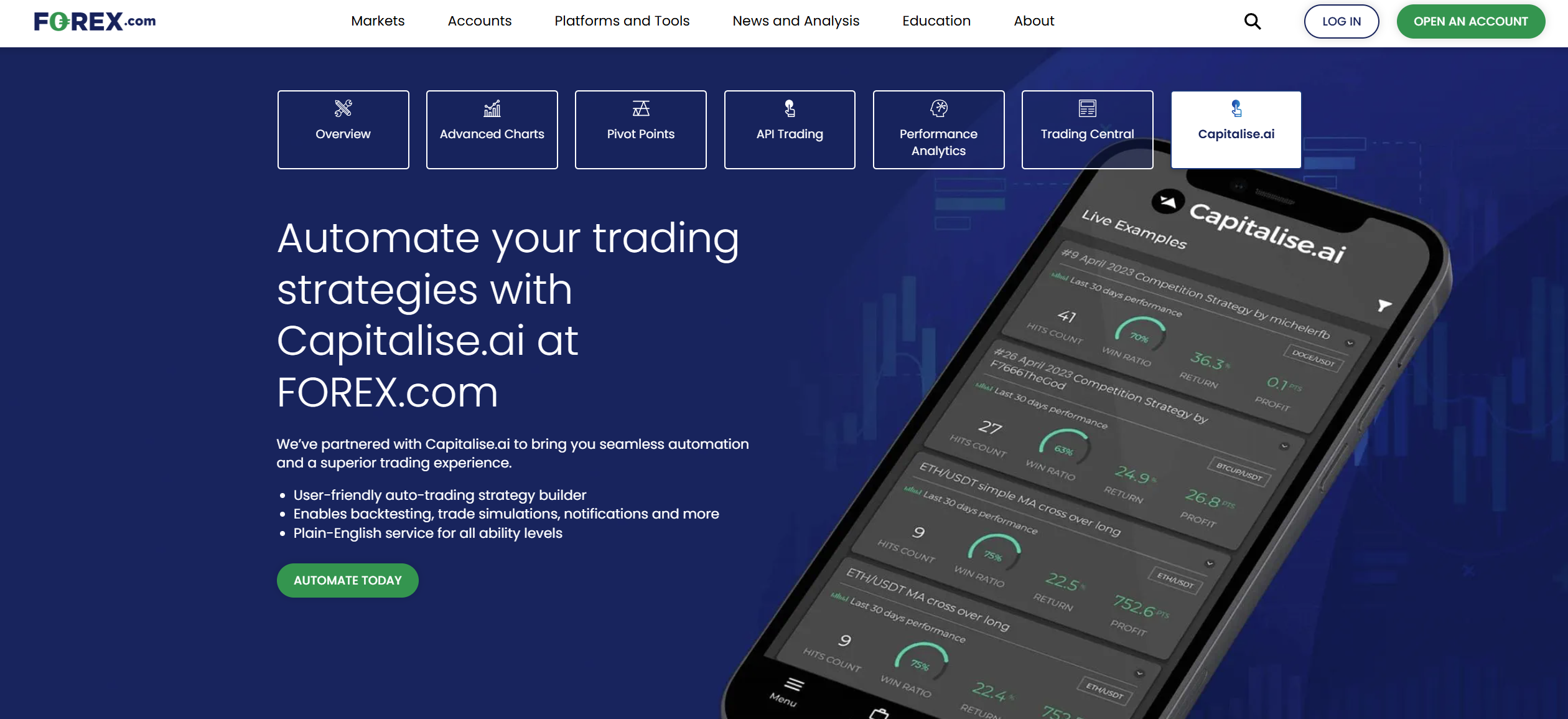 Forex.com is currently considered one of the best forex brokers in the market. This is because this broker upholds high standards and provides some of the best trading conditions to its clients. For starters, this broker is regulated in numerous jurisdictions. These include the UK by the FCA, the US by the NFA, Canada by the IIROC, and Australia by the ASIC. On this broker site, traders can automate their trading strategies with Capitalise.ai. However, please note that unlike most other platforms and trading tools, Forex.com offers Capitalise AI only in certain jurisdictions. This tool also enables backtesting, trade simulations, notifications and more.