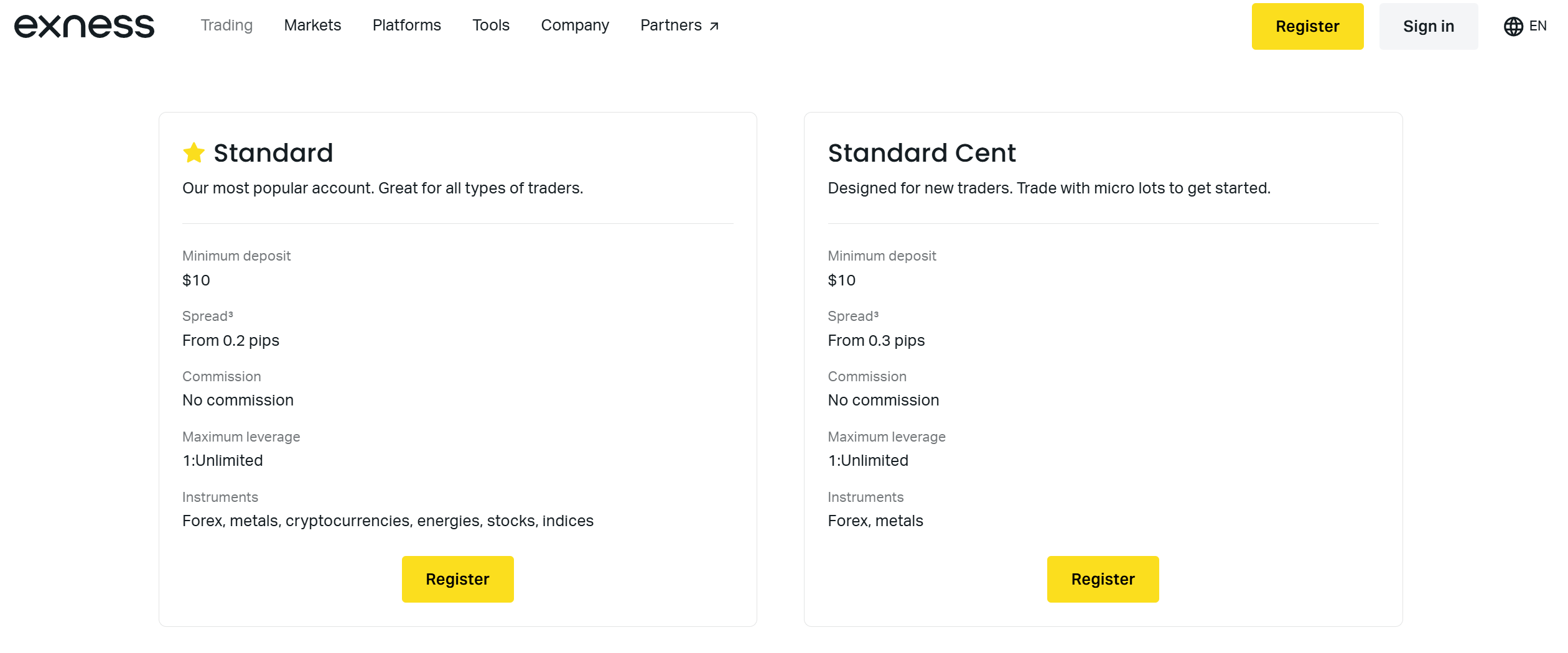Exness is one of the best forex and CFD brokers in the industry today. This broker is regulated by the CySEC, a top-tier regulator in the market. The company aims to accommodate all kinds of traders. This is why there are different types of trading accounts on Exness, including Standard and Cent accounts. The Cent account on Exness offers spreads starting from 0.3 pips, while the Standard account provides similarly low spreads, starting at 0.2 pips. Neither account charges commissions, and the minimum deposit required to open an account is just $10.