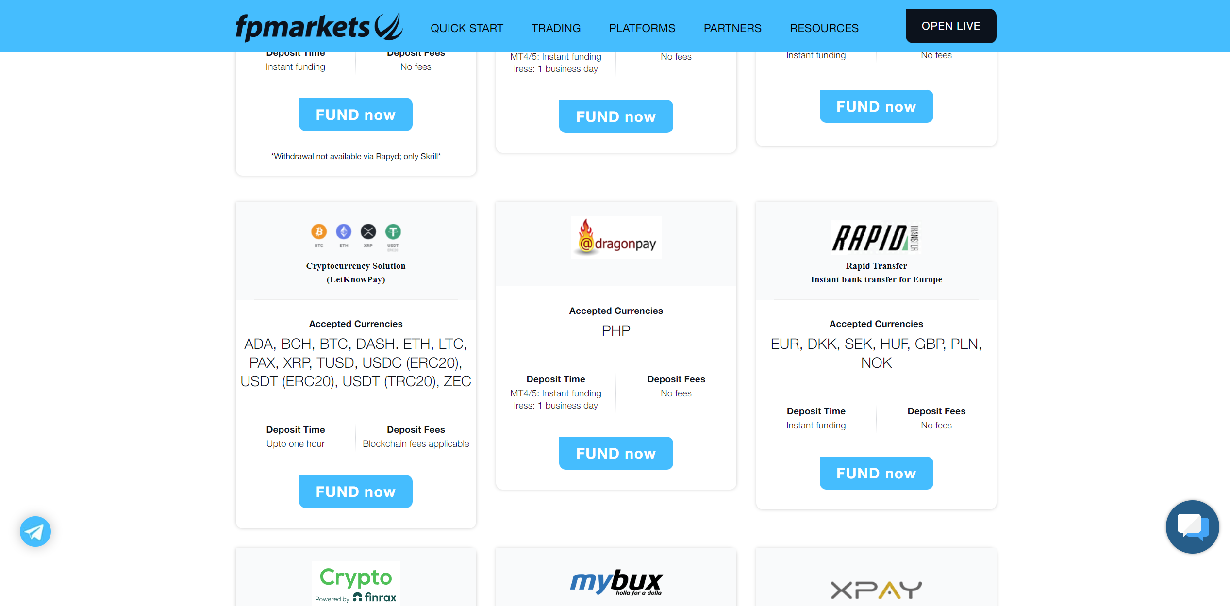 FP Markets offers over 10 flexible funding options, including Bitcoin. Funding and withdrawing money using Bitcoin is at FP Markets fairly easy and inexpensive. Traders can use various crypto payment solutions supported by the broker. These include Coinspay, B2Binpay, LetKnowPay, and more. Notably, FP Markets accepts a plethora of other cryptocurrencies for deposits and withdrawals, including Tether, Bitcoin Cash, Cardano, and Ripple.
