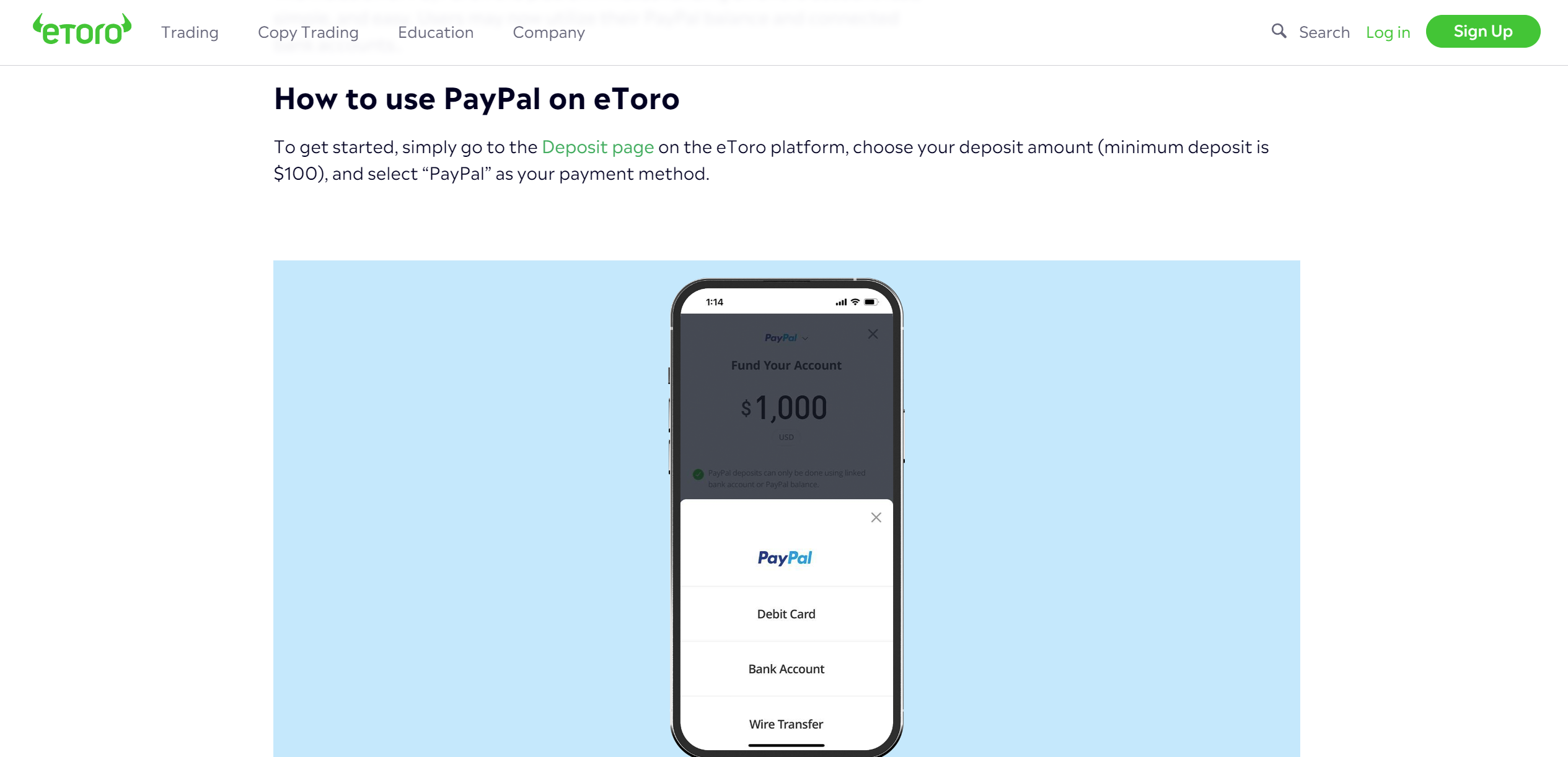 eToro allows you to deposit funds into your account using PayPal** and other payment methods such as Credit Card, Debit Card, Bank Transfer, Neteller, and Skrill. The eToro platform, built by the company, is available for clients to use. The eToro app is simple to use and designed to assist all kinds of investors by providing a user-friendly trading experience. Available for both Android and iOS devices, the app includes all the features of eToro’s web platform, including the popular CopyTrader and Smart Portfolios