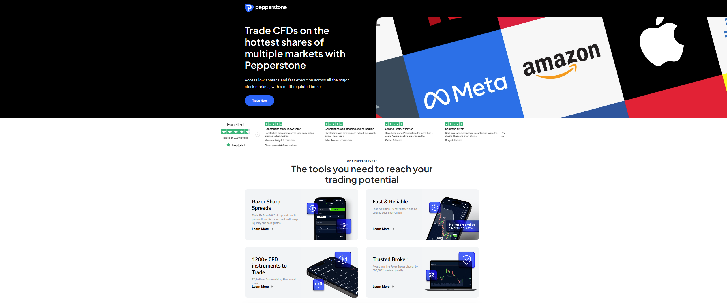 Clients can trade stocks in the form of CFDs at Pepperstone. In total, there are over 1,200 trading instruments on Pepperstone. This broker allows investors to trade CFDs on forex, shares, indices, ETFs, commodities, and currency indices. Pepperstone offers CFDs on 600+ US stocks, including large-cap businesses like Tesla Motors Inc, Apple Inc, Alibaba Group Inc, Amazon.com Inc, and Microsoft Corp. Essentially, clients have access to a variety of stock exchanges including NYSE and the NASDAQ, LSE, and ASX.