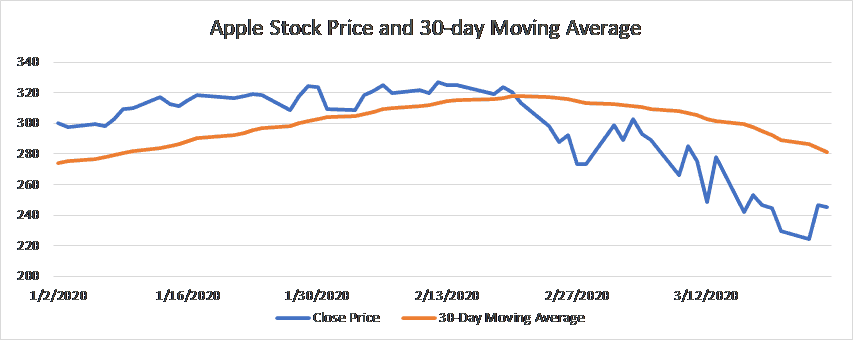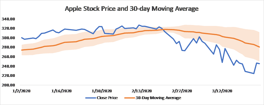 This concept is based on the moving average calculation we learned earlier, although it is a bit more sophisticated. To build the Bollinger bands for a security, we first plot the moving average. Then we add two additional lines. The upper line is the moving average plus one standard deviation of the security. The lower band is the moving average minus one standard deviation. The upper line and the lower line together form a range around the moving average. These are the Bollinger bands. Building on top of our previous example, here is what the Bollinger bands look like for Apple in 2020.