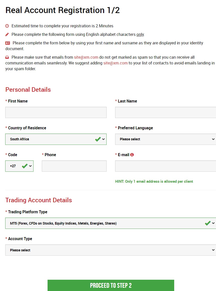If you are based in South Africa or any other country outside the European Economic Area, here is what signing up for a new XM.com account looks like.