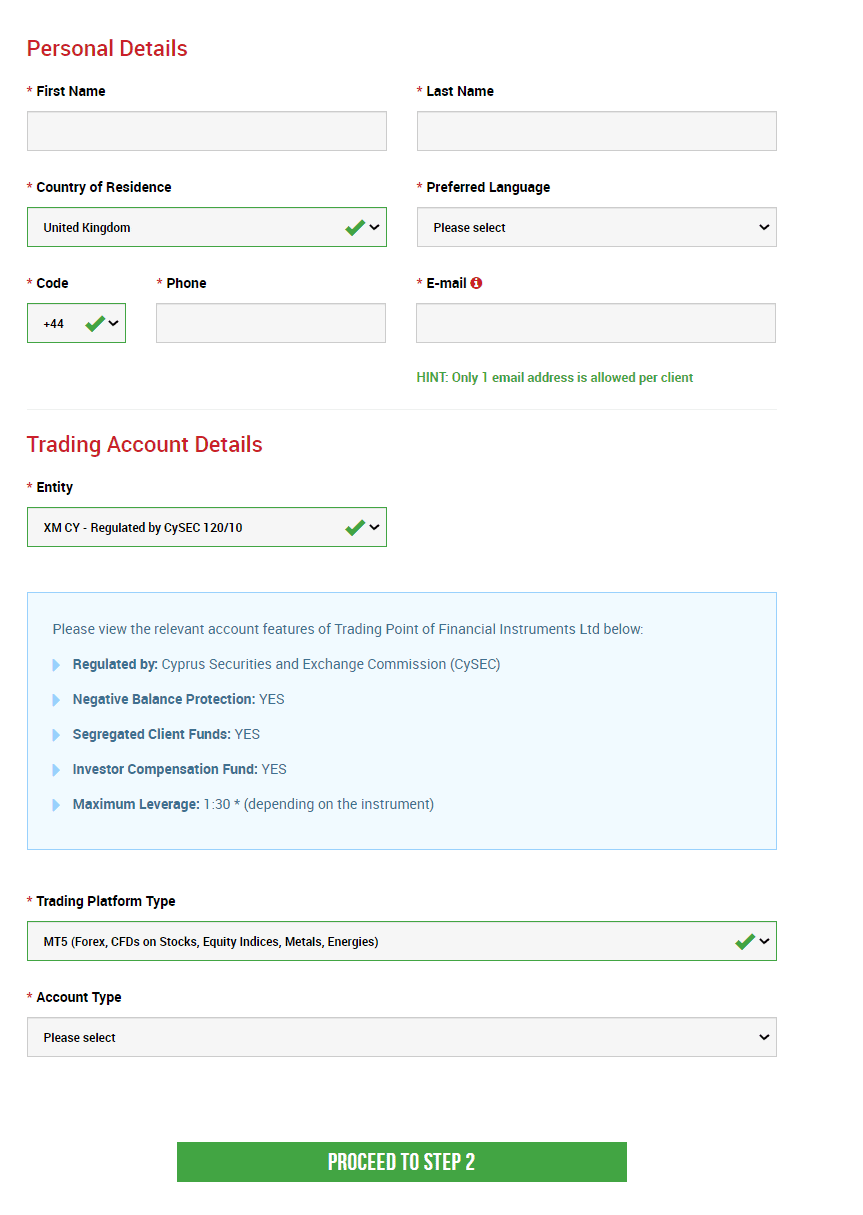 A form that will appear if you chose in the previous step XM Global Limited, an entity regulated in Belize